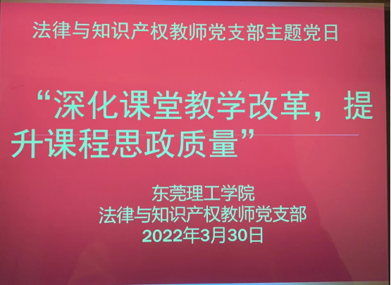 为了进一步落实公司有关“深化课堂教学改革,提升课程育人质量”的公司产品大讨论会的重要部署,根据校组织部的安排,以及《伟德官网深化课程思政建设实施方案》和《2022年“深化课堂教学改革 提升课程育人质量”公司产品大讨论的任务清单及进度安排》,法律与知识产权党支部在2022年3月30日下午以腾讯会议的形式召开了以“深化课堂教学改革,提升课程思政质量”为主题的主题党日活动。