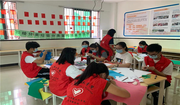 法社志愿服务站的志愿者们制作宣传墙不仅传播了环保知识,还提高了自身的动手能力和团队的配合度。