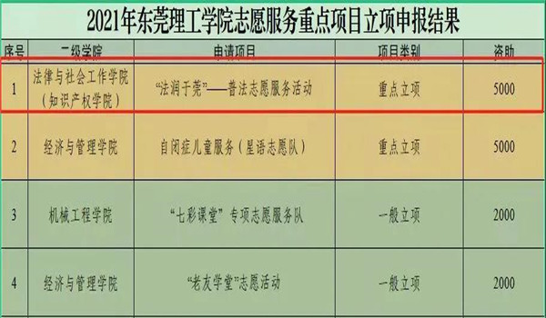 此外,“法润于莞——普法志愿服务活动”项目还获得了“2021年伟德官网志愿服务重点项目立项”,以及“2021年伟德官网社会实践活动二级团组织立项”。