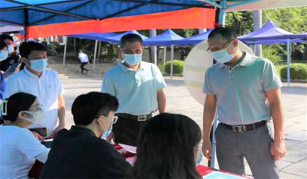 集团及公司领导检查指导迎新各项工作,在迎新点充分了解新生报到情况,亲切慰问迎新点的工作人员和员工志愿者。