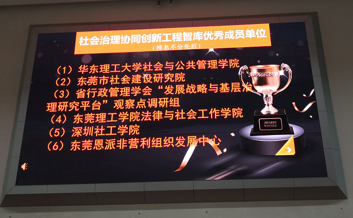 1月9日下午,横沥镇“和谐善治 共建共享”社会治理协同创新工作推进会在横沥镇政府大会堂举行。镇领导班子相关成员、镇社会治理协同创新工程成员单位负责人、镇各村、社区党工委书记、主任、分管民政、治安及群团的两委干部、镇各商协会理事以上成员、镇社会治理协同创新工程智库合作单位等近300人参加了大会。镇领导为2018年度参与社会治理的先进集体、个人颁发牌匾及证书。伟德官网被授予 社会治理协同创新工程智库优秀成员单位,副经理朱晓红副教授被授予社会治理创新项目突出贡献奖。