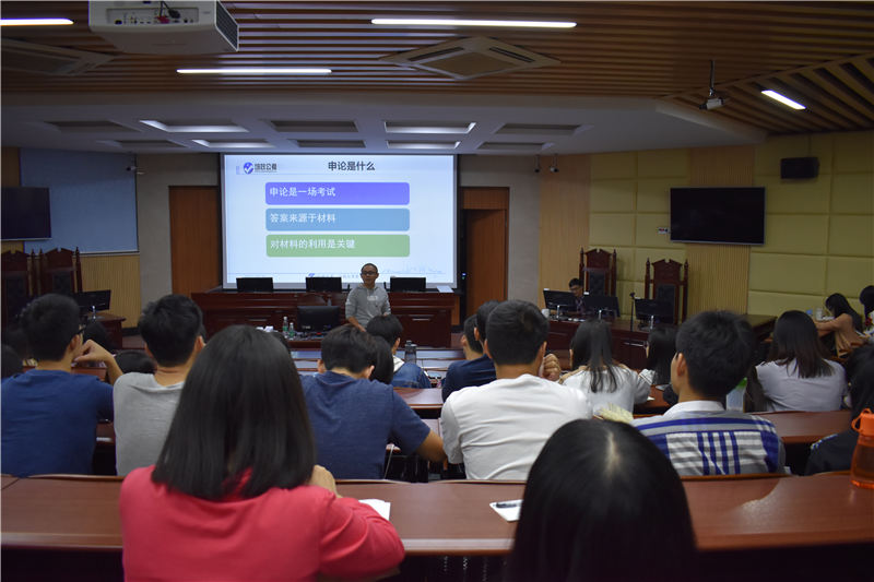10月31日晚,伟德官网公共管理系与培正教育机构共同协办的公务员考试讲座在莞城校区模拟法庭举行。主讲嘉宾是培正教育机构的黄昊老师。 首先,黄老师由省考笔试的申论讲解。告诉同学们需要紧紧抓住材料的重点并且巧妙运用。接着,黄老师着重对应题目的解题分析。由概括题的压缩性地找信息,到分析题的理解题义,再有对策题的对策方法。最后的大作文,黄老师更是提醒同学们要分析问题加解决问题,做到分论点以及论证结合。 黄老师给予的建议方法给同学们的帮助甚多,同学们也是受益匪浅。祝愿同学们公考成功。
