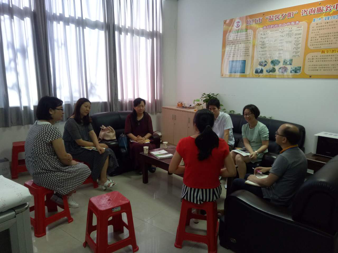 厦门考察的另一项主要目的是了解当地社会工作发展状况,因此考察团分别于23日和24日走访了厦门市“温馨夕阳”咨询服务中心和鹭辉鼓浪屿街道家庭综合服务中心。通过与机构工作人员的座谈,了解了机构的服务领域和主要服务项目,也对厦门市社工机构发展历程及现状有了整体了解。在座谈会和走访机构之余,社工系老师们还就专业建设、教师团队建设、人才培养、新生教育等方面进行了深入有效的交流讨论。