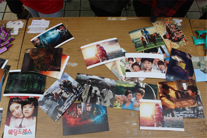 摊位的桌子上罗列了五彩缤纷的电影场景照片,电影主题有青春、文艺、动作、漫画、科幻和侦查等等,为同学们搜罗了各种各样的好电影。小游戏规则是通过辨别这些电影场景照片猜出这个电影的名称,为了增强同学们的兴趣,该活动特意采用了“刮刮乐”的形式。每张电影场景照片的背面都会有个刮条,刮条下就是该电影的正确名字。成功猜中电影名称的同学不仅可以获得这些经典照片,同时可以赢得美味的紫皮巧克力糖果。另一旁还有事先准备好的电影小视频可供同学观看,当然观看过的同学也可以进行电影的竞猜,同样正确猜出电影名称的同学也可获得紫皮巧克力糖果作为奖励。