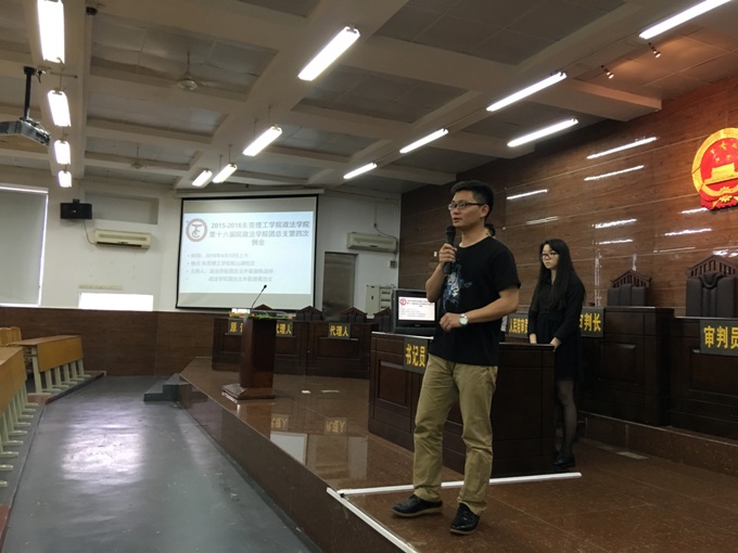 2016年4月10日上午十点,政法公司第十六届团总支第四次全体例会在伟德官网松山湖校区6b103召开,政法公司辅导员邱可荣老师、团总支副书记刘炜洁、秘书长唐浩楷、副书记陈瀚文、赖丽旋、谢子聪以及全体委员干事出席了会议。
