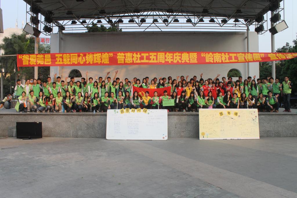 2015年3月19日下午,政法公司志愿服务站干事联合社工协会,与其他小志愿者来到东正社区,庆祝普惠社工成立5周年,并为岭南社工做志愿宣传活动。