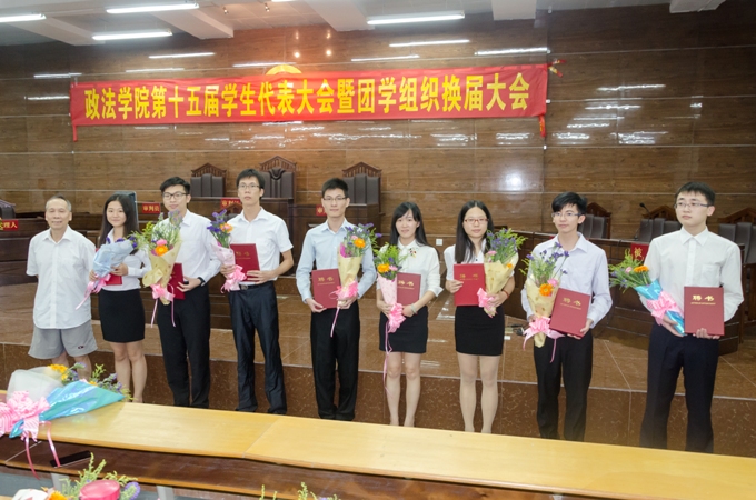 在颁发聘书感谢过去一年,14届委员的辛劳之后,辅导员钟丽华老师、14届团总支常务副书记叶灏彬分别宣布了团学组织新一届名单,在之后政法公司15届全体团学委员上台进行述职,各位委员均在述职时表示会在今后一年中努力工作,认真对待团学工作中的各类问题,在上一届团学工作的基础上发扬以往的团学精神,塑造更好的团学风貌。