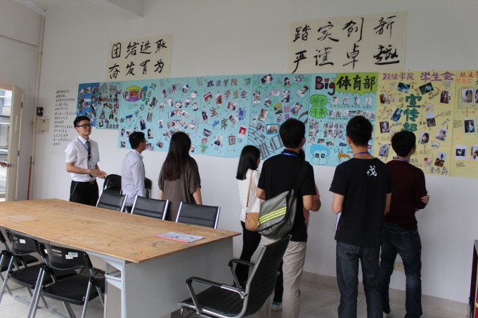 参观完毕后评委考察团回课室216,开始第二轮的考察工作,整体风貌考察。在员工会副主席叶创新的带领下,全体成员齐声唱起政法员工会会歌——《我相信》。积极向上、奋发蓬勃的会歌很好展现了员工会的精神面貌,赢得评委考察团的阵阵掌声。接而,考察团开始抽查出席人员,进行笔试知识考核。此次笔试考查内容主要涉及员工组织的相关知识以及作为员工组织的一员所需具备的基本素质考核。与此同时,政法公司员工会副主席叶创新针对过去一年来政法公司员工会的工作成绩进行了简洁而有力的总结概括,寄予对接下来一年的新的工作展望。而现场提问环节更是精彩不断,面对评委团的一个个问题,员工会全体委员对答如流,争相回答,力图更好体现员工会内部融洽,注意与同学交流沟通,而对外方面,又不乏沟通联系的先进集体形象。