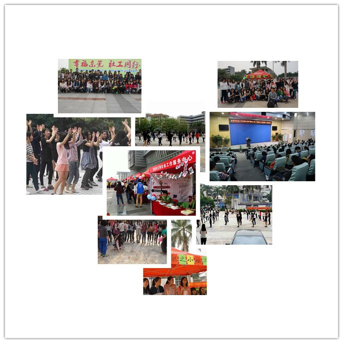 2014年3月18日—3月28日,东莞市社工相关单位与机构相继开展活动喜庆“国际社工日”及行业发展五周年纪念。为表达对社工节日以及行业的祝福,在此活动期间,2013级社会工作专业员工在成伟教授以及两位青年老师的带领下,在莞城校区开展了名为“东莞社工五周年,我们也来庆”系列宣传活动。