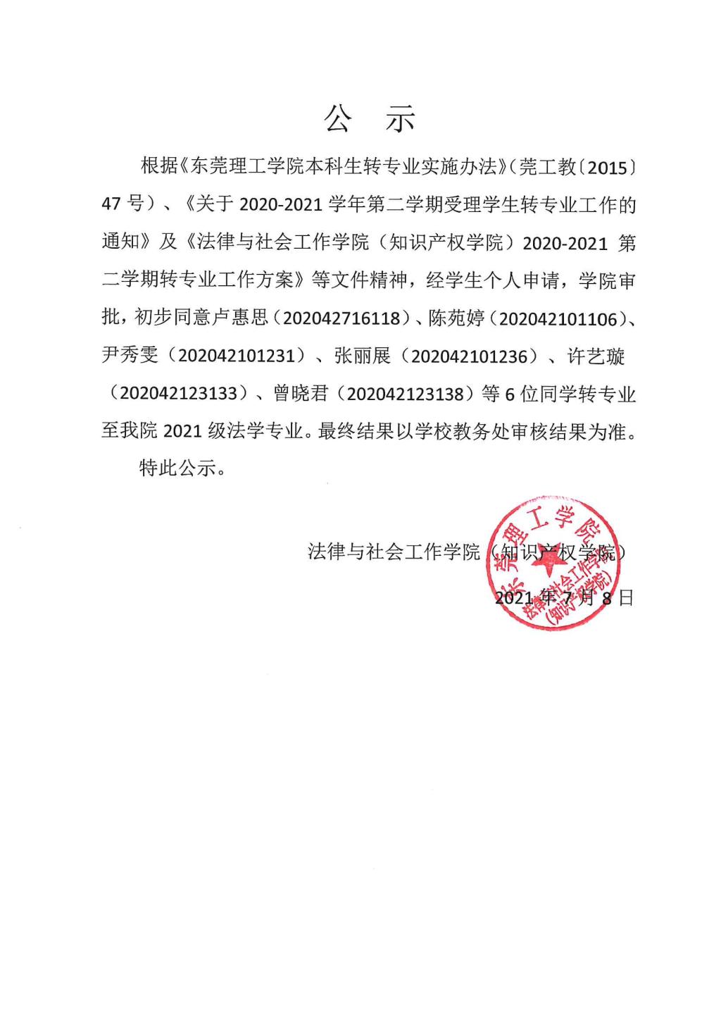 关于其他院系员工转专业至公司的公示