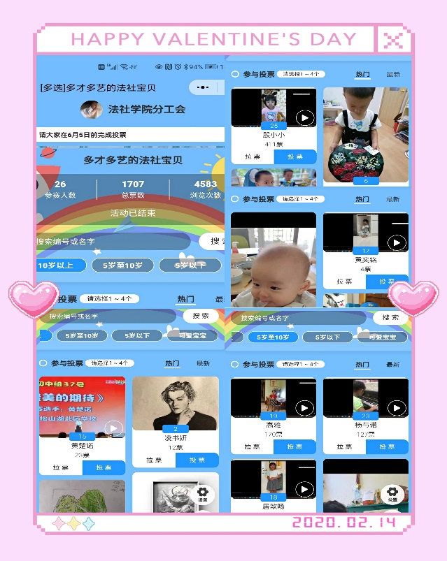 在短短几天时间内,组织者就收到了26个孩子的才艺素材,有栩栩如生的素描作品,有美妙的童声演唱,有各种乐器演奏,还有手工秀、英语秀、朗诵秀等,小宝贝们也展示了各种可爱的小技能。鉴于孩子们的年龄差异,组织者按照年龄段合理分成4组,并发起线上投票。投票过程非常刺激,竞争也很激烈,到截止时间,投票总次数超过1700票,浏览次数更是超过4500次。经过几天的投票角逐,每个组均有一半的小朋友获得优秀才艺奖。