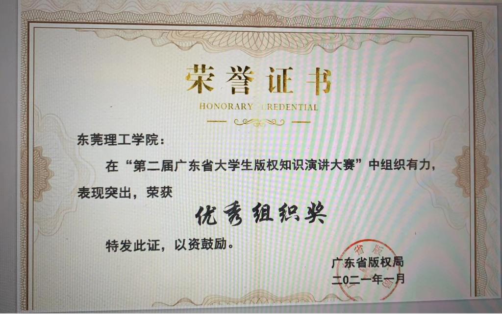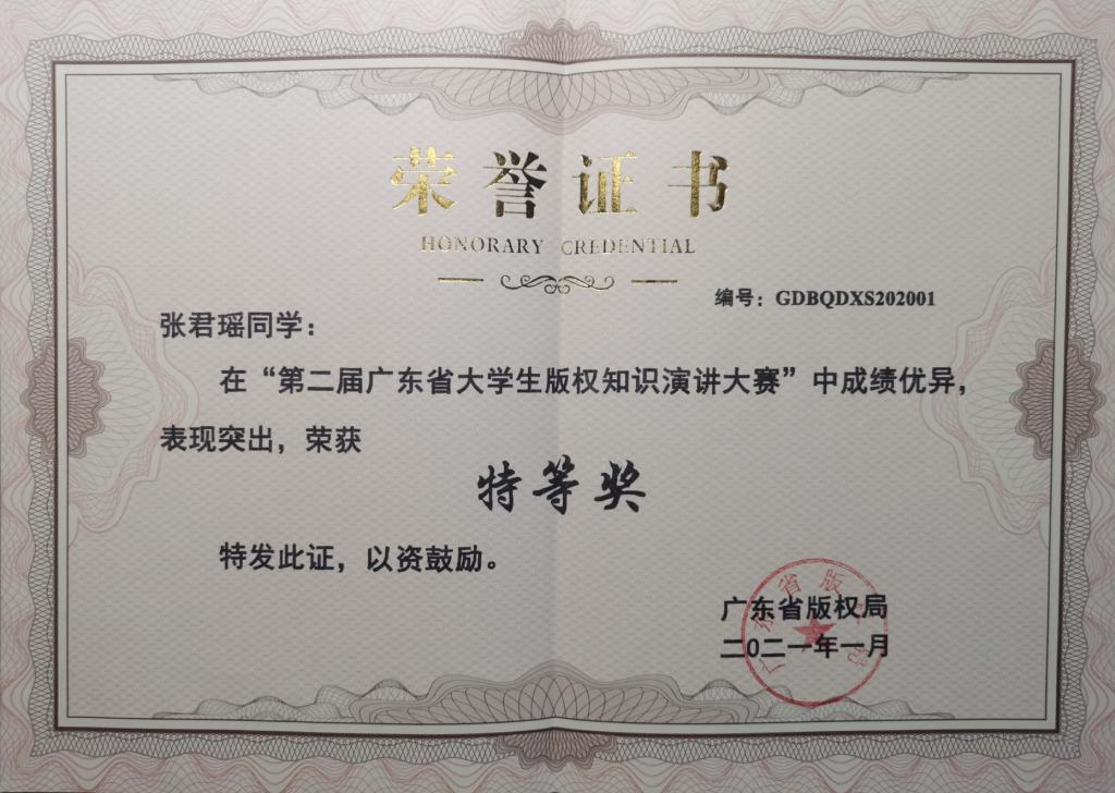 张君瑶荣获第二届广东省老员工版权知识演讲大赛唯一一个特等奖。