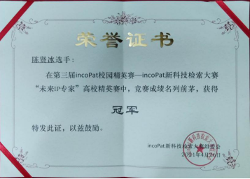 特色活动8:组织同学参加全国第三届incoPat校园精英赛——incoPat新科技检索大赛“未来IP专家”高校精英赛, 陈贤冰荣获得冠军