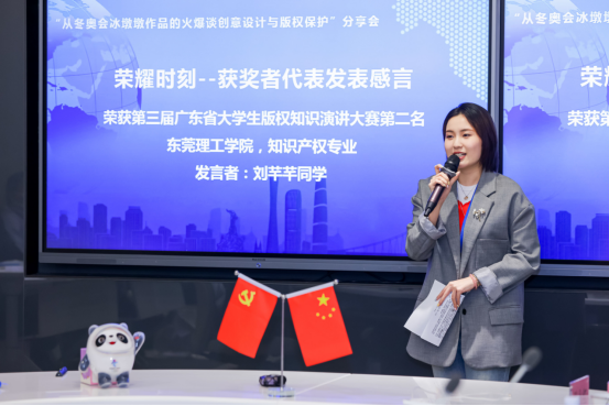 “第三届广东省老员工版权知识演讲大赛”第二名2020级法学(知识产权)1班的刘芊芊同学发表获奖感言。