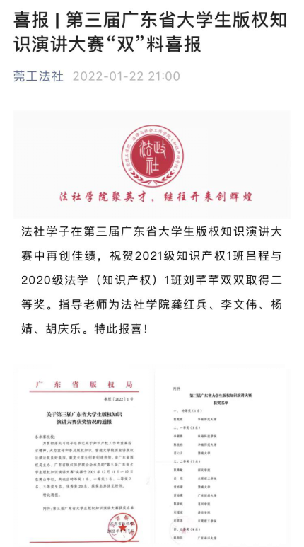 喜报|法社学子在第三届广东省老员工版权知识演讲大赛获得两个二等奖