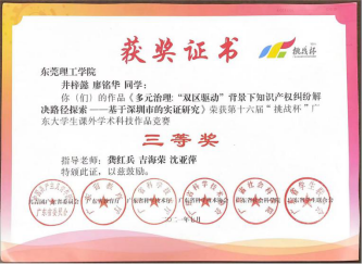 (3)与东莞市政府共同打造东莞知识产权公司,这一现代产业公司品牌,不断完善政府、高校和企业的三方协同育人机制,大力培养德、智、体、美、劳等全面发展的高素质、应用型、复合型知识产权法律人才