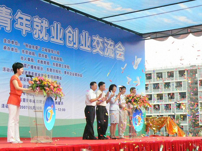 5月26日上午,由东莞市“创业东莞”工程小组主办,市劳动局、团市委、市财政局、教育局、人事局、伟德官网、东莞广播电视台、东莞日报社、市青年企业家协会共同承办的“东莞青年就业创业交流会”于公司篮球场隆重举行。出席该活动的领导嘉宾有东莞市副市长李小梅、东莞理工公司党委副书记王江水、市关工委副主任傅泽铭、团市委副书记叶淦奎、市人事局副局长莫达兴、市教育局副局长黄金海等。另外,九十多名成功就业、创业的典型代表们也受邀亲临活动现场。