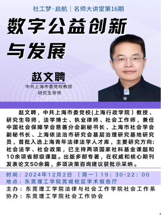 为更好地学习贯彻习近平总书记关于公益慈善发展的重要精神,2024年12月2日晚,社会工作品牌活动社工梦·启航名师大讲堂第16期在莞城校区小剧场举办。本次名师大讲堂活动邀请了中共上海市党校赵文聘教授为公司师生作《数字公益创新与发展》的学术报告,活动由社会工作系主任成伟教授主持。