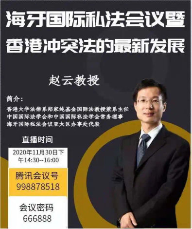2020年11月30日,伟德官网邀请到了香港大学法律系郑家纯基金国际法教授兼系主任、中国国际法学会和中国国际私法学会常务理事、海牙国际私法会议亚太区办事处代表赵云教授为我们开展了以“海牙国际私法会议暨香港冲突法的最新发展”为主题的讲座。讲座以腾讯会议的方式在莞城校区5303教室举办,由王敬华副教授主持,2018级法学1、2班全体同学到场聆听。