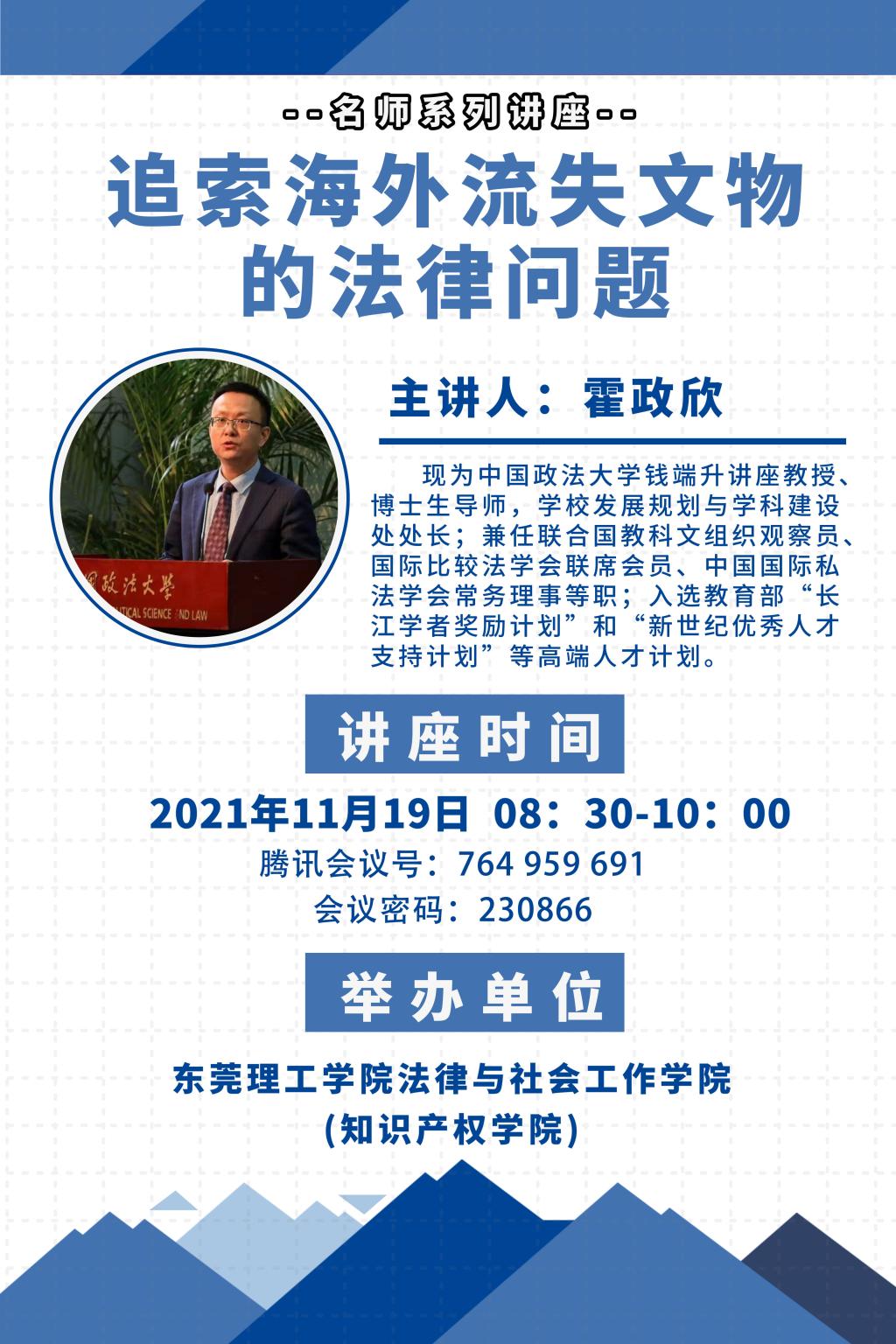 2021年11月19日,霍政欣教授应邀为伟德官网法律系的员工举办了《追索海外流失文物的法律问题》专题讲座。霍政欣教授现为中国政法大学钱端升讲座教授、博士生导师、公司发展规划与团队建设处处长;兼任联合国教科文组织观察员、国际比较法学会联席会员、中国国际私法学会常务理事等职;入选教育部“长江学者奖励计划”和“新世纪优秀人才支持计划”等高端人才计划。