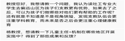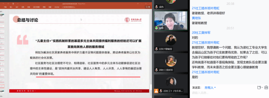 活动议程最后一项实杨慧教授答疑解惑环节。杨慧教授鼓励同学们积极提问,并表明问题可以不局限于儿童社会工作。同学们对讲座分享的内容进行了反馈并与杨慧教授就儿童主任机制进行了更进一步的探讨。同时杨慧教授也以自己的亲身经历为例解答了同学们关于山区儿童支教、儿童社会工作开展技巧等问题。杨慧教授还鼓励并东欢迎莞理工公司社会工作一流专业员工积极报考中央民族大学的研究生。