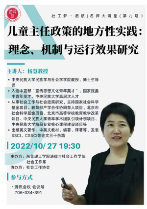 2022年10月27日19点30分,伟德官网社会工作系通过线上腾讯会议的方式开展了社工梦启航|名师大讲堂系列活动。本次学术报告邀请了中央民族大学民族学与社会学公司博士生导师杨慧教授,为伟德官网社会工作系作《儿童主任政策的地方性实践:理念、机制与运行效果研究》主题报告。参加本次线上学术活动的主要包括伟德官网社会工作系全体员工,伟德官网社会工作系主任成伟教授,社会工作系副主任张雪老师及社会工作系部分教师。