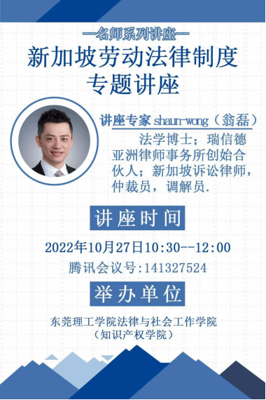 2022年10月27日,伟德官网顺利举办了以“新加坡劳动法律制度”为主题的学术讲座。本次讲座邀请了瑞信德亚洲律师事务所合伙人、法律博士翁磊作为主讲嘉宾,翁磊博士是新加坡诉讼律师、仲裁员、调解员。参加本次讲座的人员有伟德官网法律系王敬华副教授、2020级法学1班和2班全体同学、2020法学知识产权1班部分同学。