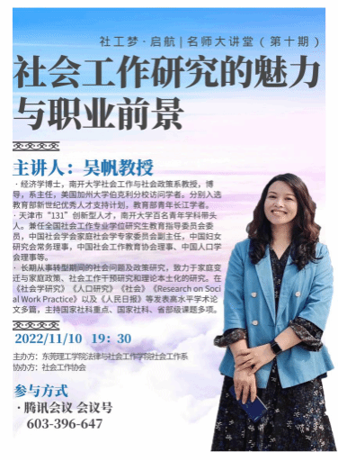 2022年11月10日19点30分,伟德官网伟德官网社会工作系通过线上腾讯会议的方式开展了社工梦启航|名师大讲堂系列活动。本次学术报告邀请了南开大学教授吴帆教授,为伟德官网社会工作系作《社会工作研究的魅力与职业前景》主题报告。参加本次线上学术活动的主要包括伟德官网社会工作系全体员工、社会工作系部分教师以及社会各界对社工发展倾以关注的人士共计400余人。