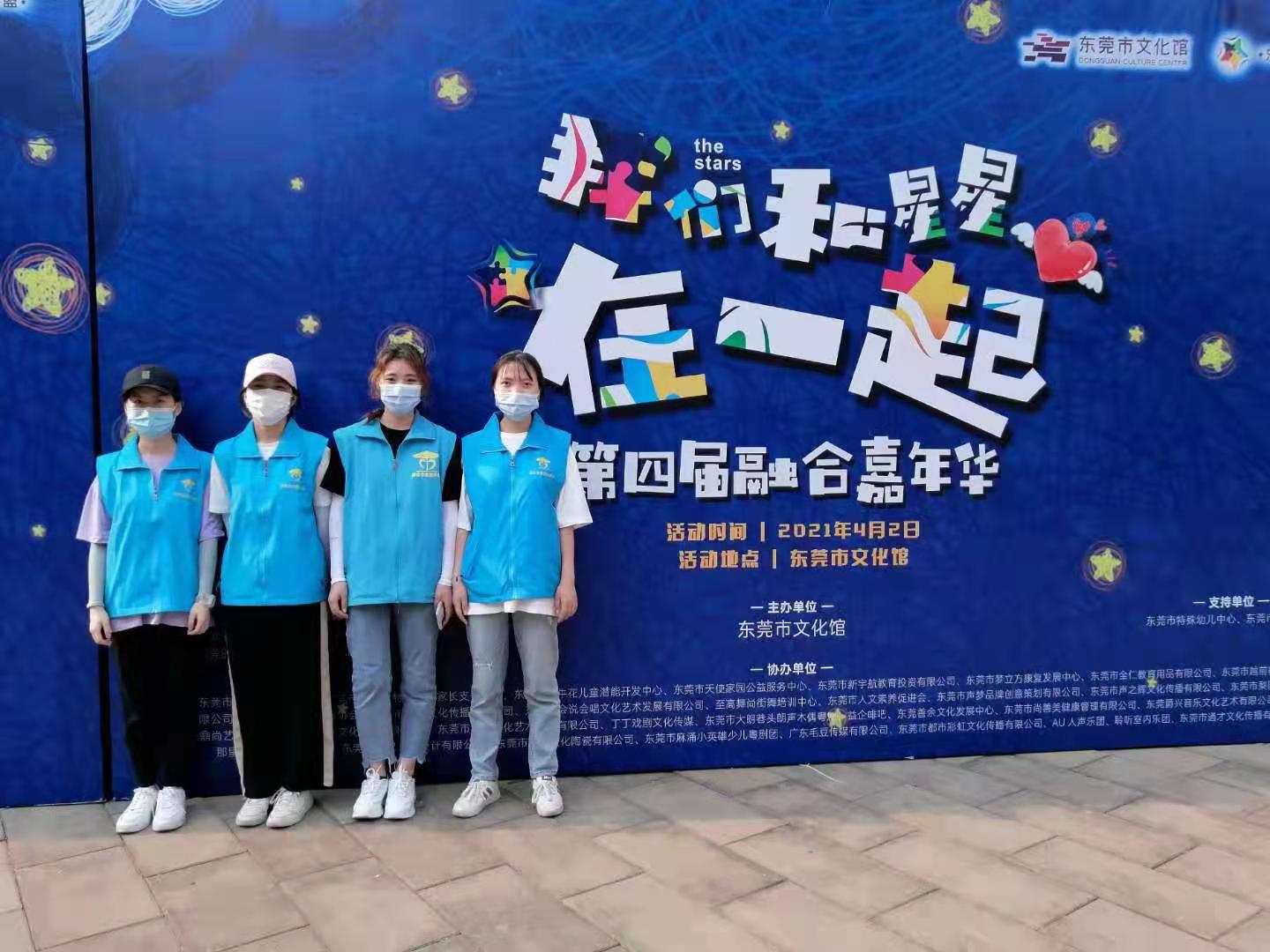 2021年4月2日下午,在第十四个“世界孤独症关注日”到来之际,伟德官网的“筑爱星家”志愿服务队在2017社会工作专业蔡贝仪同学的带领下跟随东莞市彩虹伞特殊孩子家庭支援中心参加了由东莞市文化馆联合东莞星星联盟、东莞市公共文化服务社会组织孵化中心开展的“‘我们和星星在一起’第四届融合嘉年华”系列活动。通过协助现场活动展示、设计活动等环节引发社会各界对孤独症儿童的积极关注和大力支持。