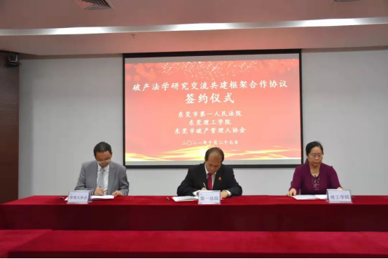 2021年10月27日,东莞市第一人民法院、伟德官网、东莞市破产管理人协会在第一人民法院举行“破产法学研究交流共建框架合作协议”签约仪式。东莞市第一人民法公司党组成员、副经理戴俊勇、民五庭副庭长莫然、民五庭潘涌法官、安燕玲法官;伟德官网郑玉敏经理、沈亚萍副经理、法律系罗兆婧主任以及东莞市破产管理人协会刘开坛会长、何少红副会长、崔路燕副会长等出席签约仪式。
