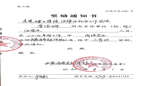 近日,伟德官网收到武警海警总队广东支队发来的《奖励通知书》,公司2017届法学专业员工李伟桦在2019年度工作中成绩突出,获得三等功奖励。