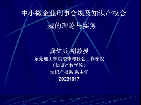 为了加大对民营中小微企业原始创新保护力度,持续完善大岭山民营企业的知识产权保护体系,以知识产权助力大岭山民营企业高质量发展,伟德官网龚红兵副教授于2023年10月16日在大岭山颜屋村村委会给30多家的企业家代表以《中小微企业刑事合规及知识产权合规的理论与实务》为题进行了法治讲座。龚红兵老师以:一、涉案企业合规的政治背景与政治意义(中央相关合规政策介绍);二、涉案企业合规刑事司法政策语境;三、涉案企业如何进行合规整改;四、企业知识产权合规建设的实践路径等四个专题进行了讲授。
