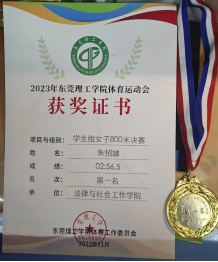 个人赛中朱招娣同学凭借出色的耐力和稳健的策略,以2分56秒的成绩夺得女子800米金牌。拼搏的精神和过硬的实力是她夺冠的利器,负责后勤的同学周全的工作是她夺冠的保障。这个胜利当属23知产1班整个集体。