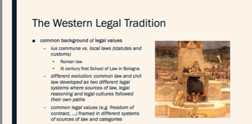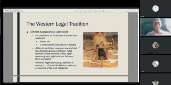 Barbara Verri教授首先讲述了普通法和民法法系的区别,包括其发展背景、特点和区别。普通法起源于11世纪的英格兰,以案例判例法为主,遵循先例。而民法法系则是在欧洲的法国、意大利、德国等地产生,主要是立法机关,如民法典、刑法典等。在大陆法系中,案例没有约束力,法官只需解释法律,依据事实判决案件。此外,普通法和民法法系在法律渊源和分类上有一定的相同之处。