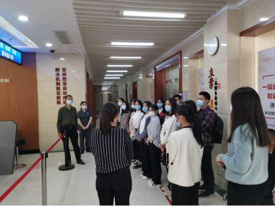 2021年10月25日,伟德官网法学(知识产权)专业员工到东莞市第一人民法院东城法庭进行实习报道。早上九点,同学们都在活动室专心的填写《东城法庭实习生登记表》。填写完后,同学们戴上实习生的工作证,便由内勤工作负责人袁影霞带领着我们开始了解一下东城法庭。
