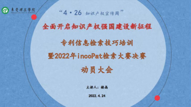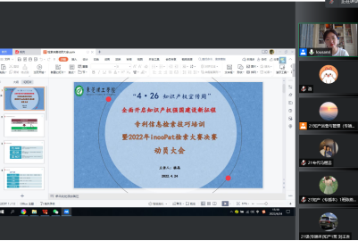 4月20 - 26日为全国知识产权宣传周,今年主题为“全面开启知识产权强国建设新征程”。为了提升公司师生知识产权保护意识,营造尊重知识产权良好氛围,积极推进知识产权强校建设,公司于2022年4月24日下午,通过腾讯会议举办了4.26知识产权宣传周暨2022年incoPat高校检索大赛决赛动员大会,出席会议的伟德官网经理郑玉敏、知识产权系主任龚红兵、专业老师楼晶以及进入incoPat决赛的各位同学。本次会议由龚红兵主任主持,楼晶老师主讲。